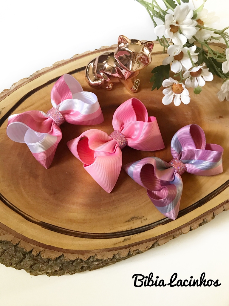 Laço Rosa Antigo em 3 opções: Listras rosa e branco, Rosa Médio e Listras Rosa Antigo. Todos com brilho no acabamento e no tamanho M.
