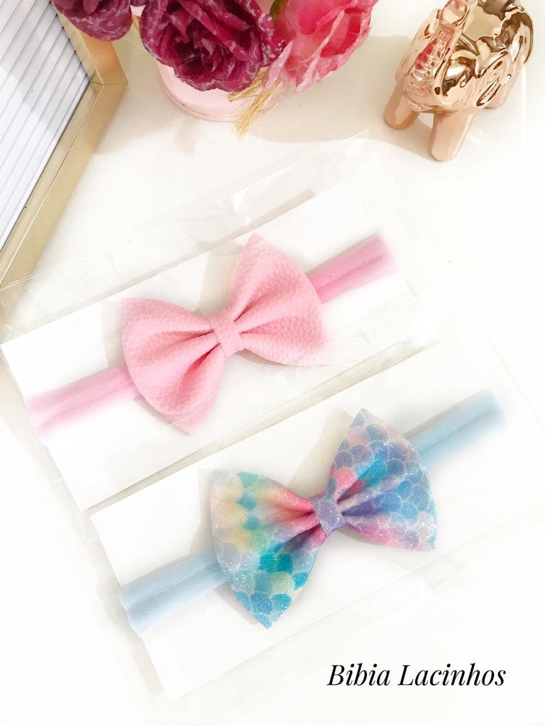 O kit compõe 2 faixinhas baby, uma rosa e outra com estampa de sereia e glitter, as duas no tamanho P.