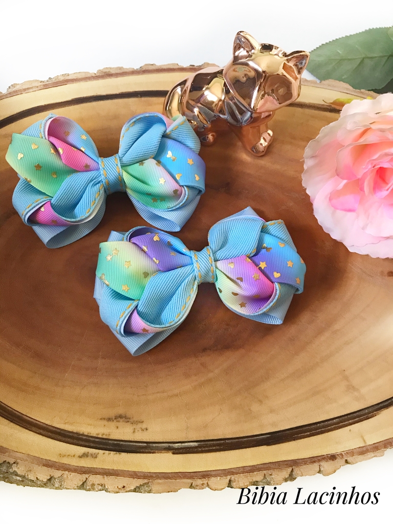 Laço em Jeans Claro e fita colorida no tamanho M.