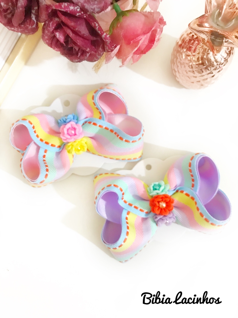 Laço Boutique listrado cores Candy com flores 3D (fundo rosa ou lilás), no tamanho G.