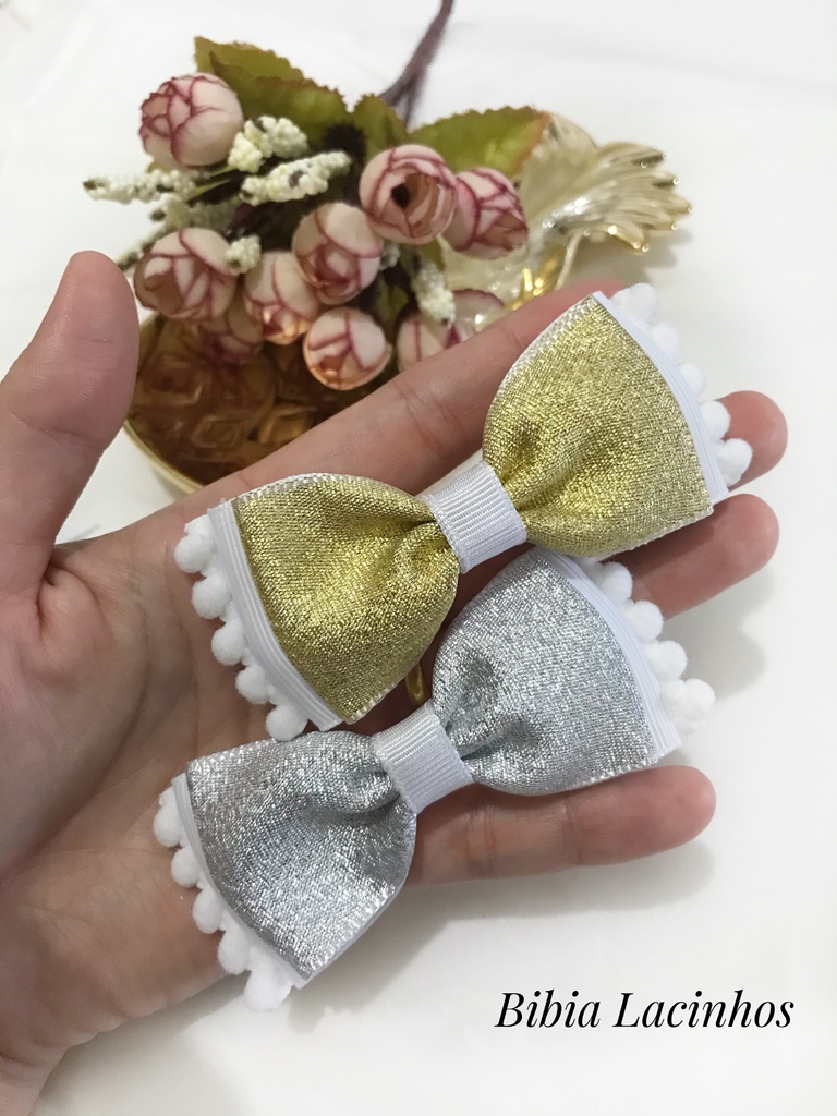 O kit compõe 2 lacinhos gravatinha, um em dourado e outro prata, ambos no tamanho P.