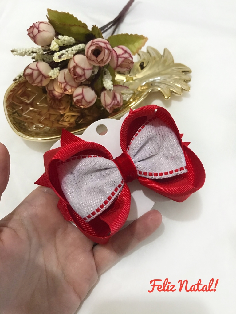 Laço da Coleção de Natal em duas opções de cores: vermelho com brilho ou vermelho com branco, ambos no tamanho M.