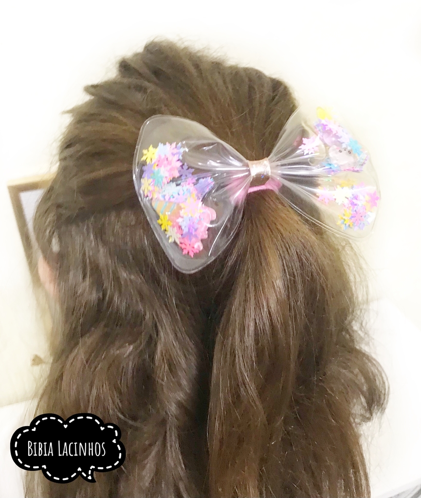 Laço de plástico com confetes e sorvetinho colorido dentro, no tamanho G.