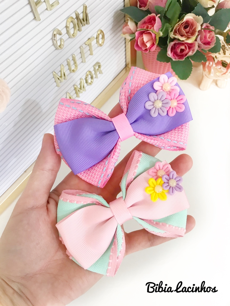 Laço Eva com flores de tecido, em duas opções de cores: rosa e lilás ou rosa e verde, ambos no tamanho M.
