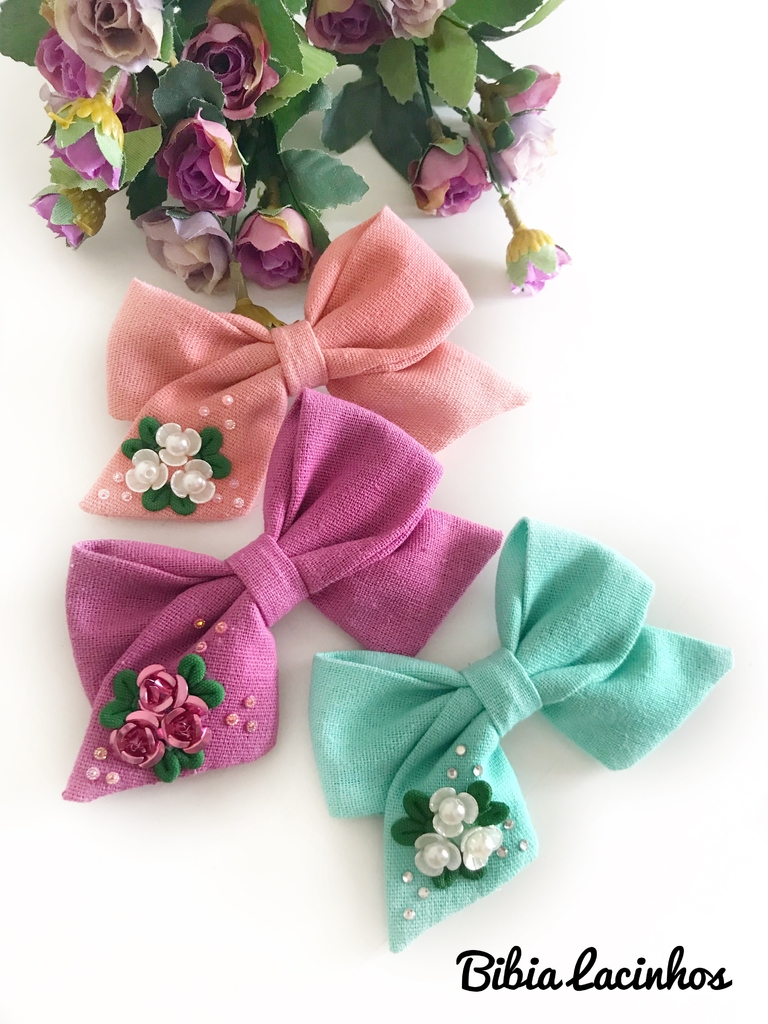 Laço em linho com aplique de flores e brilho, em 3 opções de cores: Verde, Salmão e Rosa. Todos os produtos da Bibia Lacinhos são produzidos com materiais de qualidade visando maior durabilidade. Prazo de 7 dias para produção.