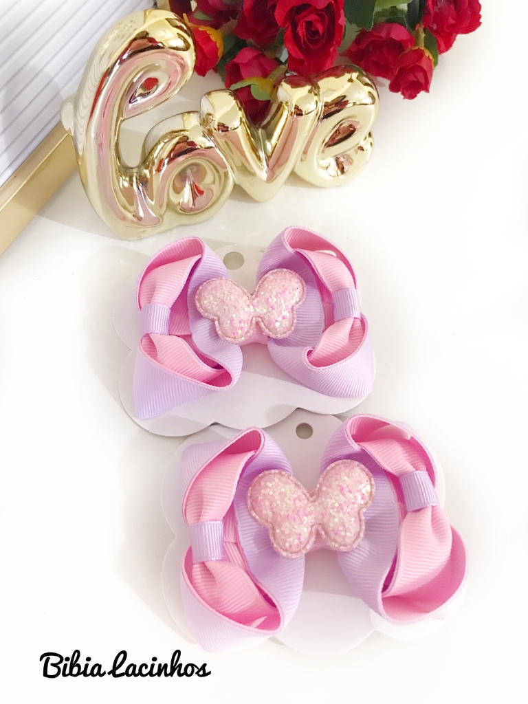 Laço nas cores rosa e lilás e tamanho P, com apique de borboleta no acabamento.