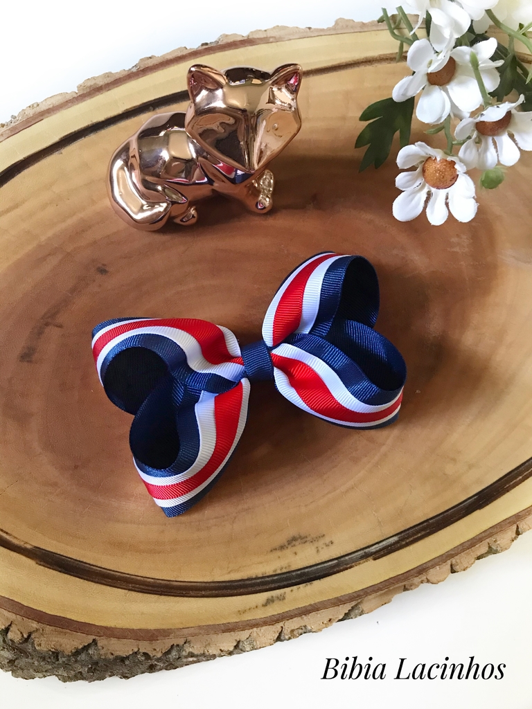 Laço Boutique com fita em 3 cores: Azul marinho, branco e vermelho, com pontas ou sem pontas no tamanho G.