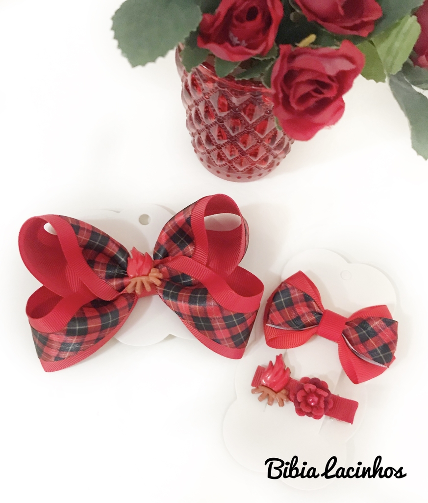 Laço tamanho G com aplique de fogueira. Par de Hair Clips tamanho P. Todos os produtos da Bibia Lacinhos são produzidos com materiais de qualidade visando maior durabilidade. Prazo de 7 dias para produção.