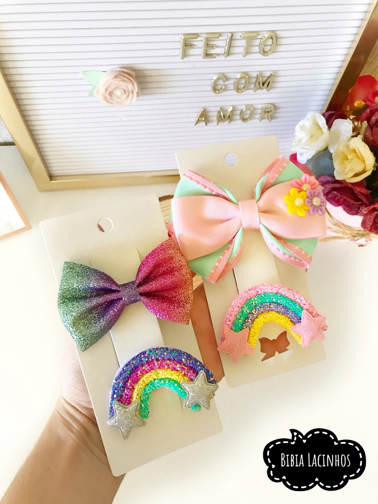 O kit compõe 1 laço M e 1 Hair Clip arco-íris, em duas opções: Roxo ou Rosa.