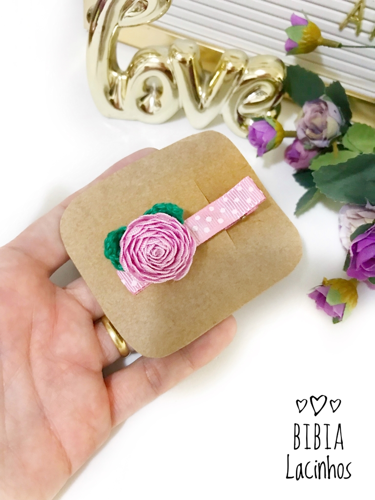 Presilha rosa de bolinhas com flor em tecido. Todos os produtos da Bibia Lacinhos são produzidos com materiais de qualidade visando maior durabilidade. Prazo de 5 dias para produção.