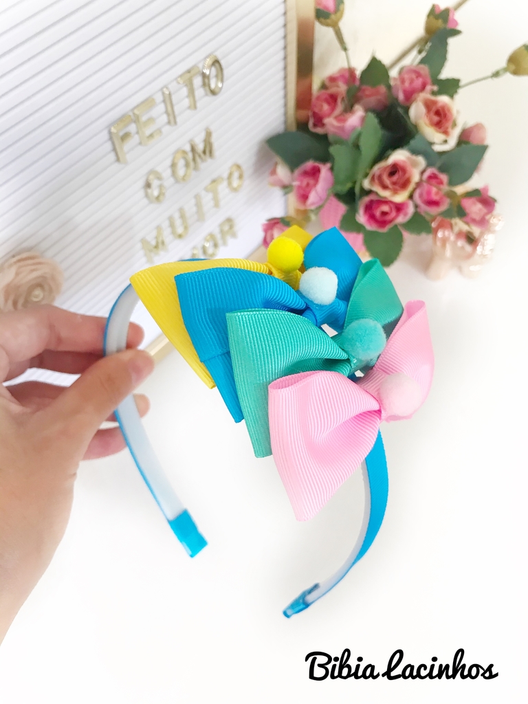 Tiara com lacinhos e pompons coloridos no tamanho P.