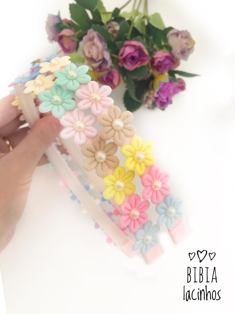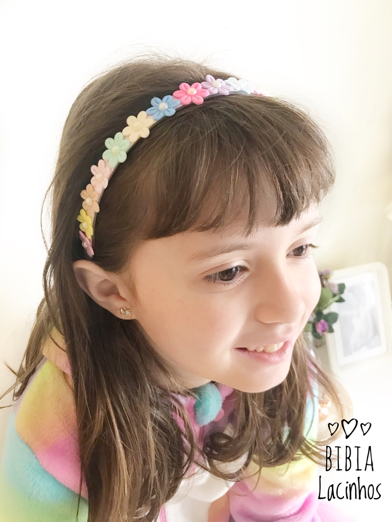 Tiara com flores coloridas em tons pastel. Todos os produtos da Bibia Lacinhos são produzidos com materiais de qualidade visando maior durabilidade. Prazo de 7 dias para produção.