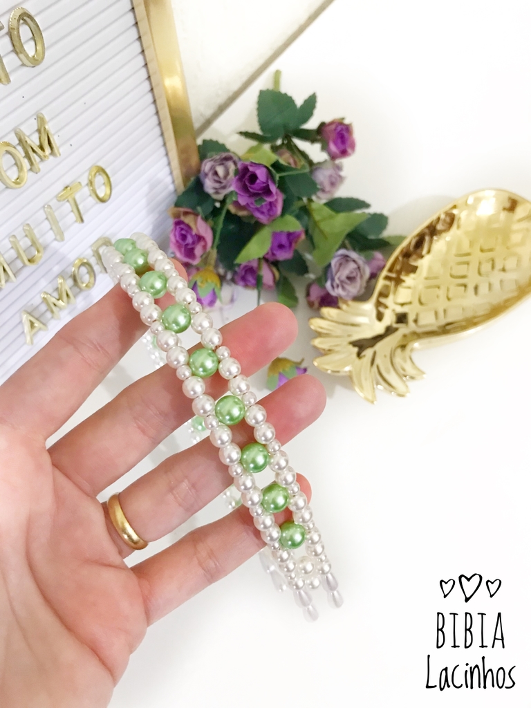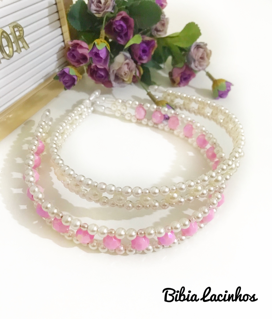 Tiara de pérolas trançada com dois fios em 4 opções de cores: Básica pérolas creme, Creme marmorizada, creme com verde, creme com rosa.