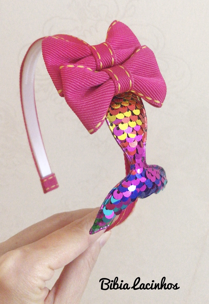 Tiara na Cor Pink com aplique de cauda de sereia com paêtes coloridos. Todos os produtos da Bibia Lacinhos são produzidos com materiais de qualidade visando maior durabilidade. Prazo de 5 dias para produção.